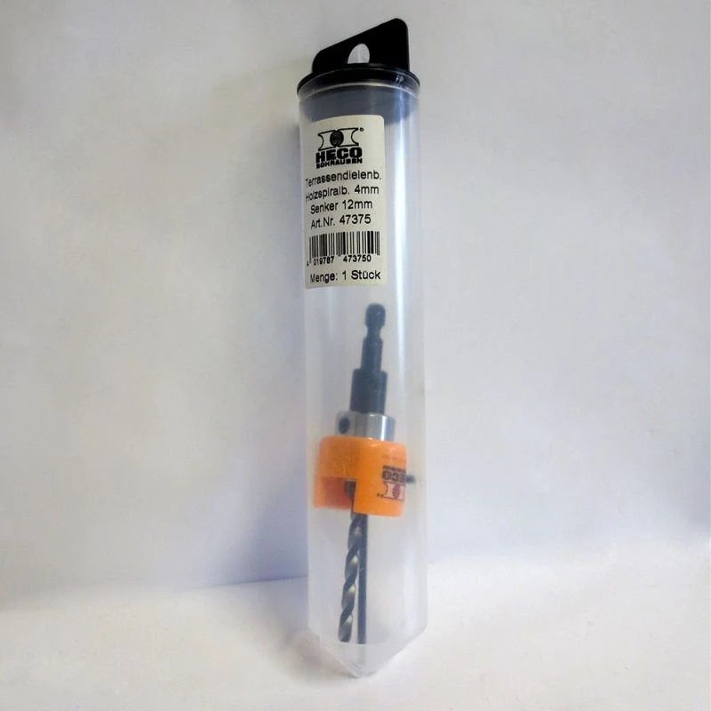 Le foret fraisoir HECO est composé d’un foret à bois de 4 mm de diamètre réglable en profondeur pour le pré-perçage des trous de vis, d’un fraisoir et d’une butée de profondeur mobile en PVC de haute qualité, évitant les traces lors du contact avec le support.