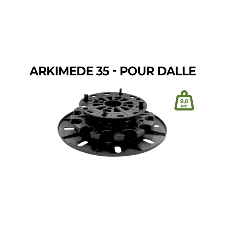- ARKIMEDE 18 (DAK-TER09-1145/4A2M) dispose d’un support réglable tête 4 écarteurs – joint de 2 mm, le plot terrasse est réglable de 18 à 36 mm, poids 0.154 kg